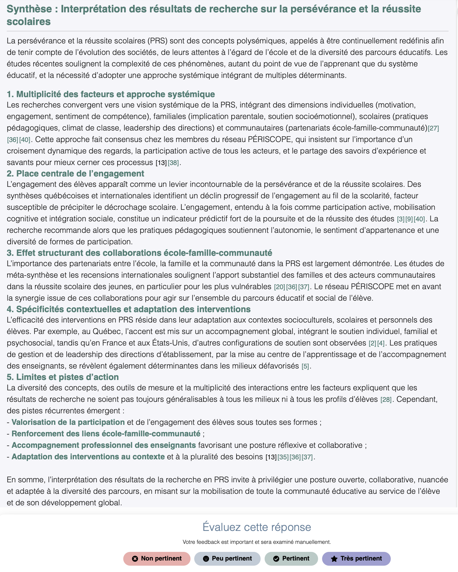 Cette nouvelle façon de consulter le site PÉRISCOPE donne accès à de courtes séquences audio ou vidéo produites à partir de requêtes formulées à PÉRO, le robot conversationnel de PÉRISCOPE, sur des questions d’intérêt en lien avec la persévérance et la réussite scolaires (PRS). Nous vous invitons donc à visionner (4 min.) une première production avec la courte vidéo Maths: fatalité ou défi ?. Réussite et aversion des élèves envers les mathématiques - NotebookLM Vous constaterez ce que PÉRO rapporte à ce propos en s’appuyant sur les publications des chercheures et chercheurs membres de PERISCOPE et sur son corpus scientifique. Si vous souhaitez aller plus loin, il est également possible de soumettre votre propre questionnement à PERO. Nous comptons aussi sur vous pour faire découvrir le potentiel de PERO à d’autres agents de votre milieu. La diffusion de la présente vidéo et d’autres à venir sont autant d’occasions propices pour ce faire.